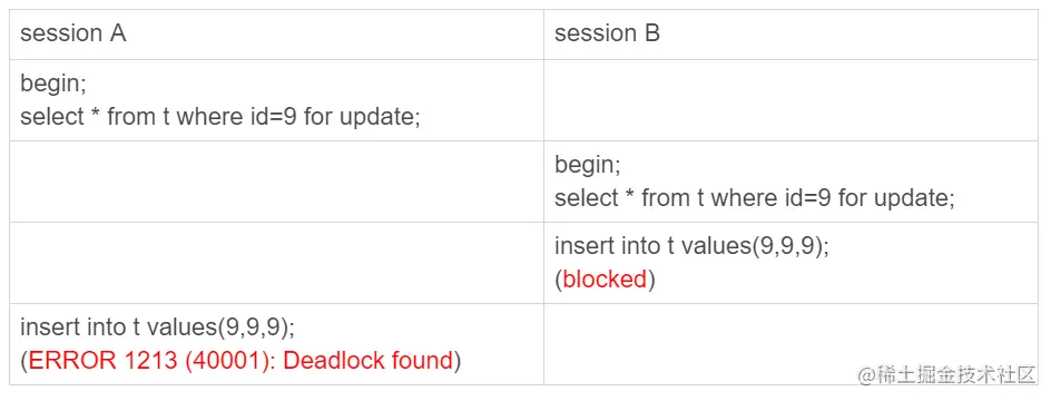 - session A 执行 select … for update 语句,由于 id=9 这一行并不存在,因此会加上间隙锁 (5,10);