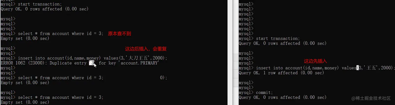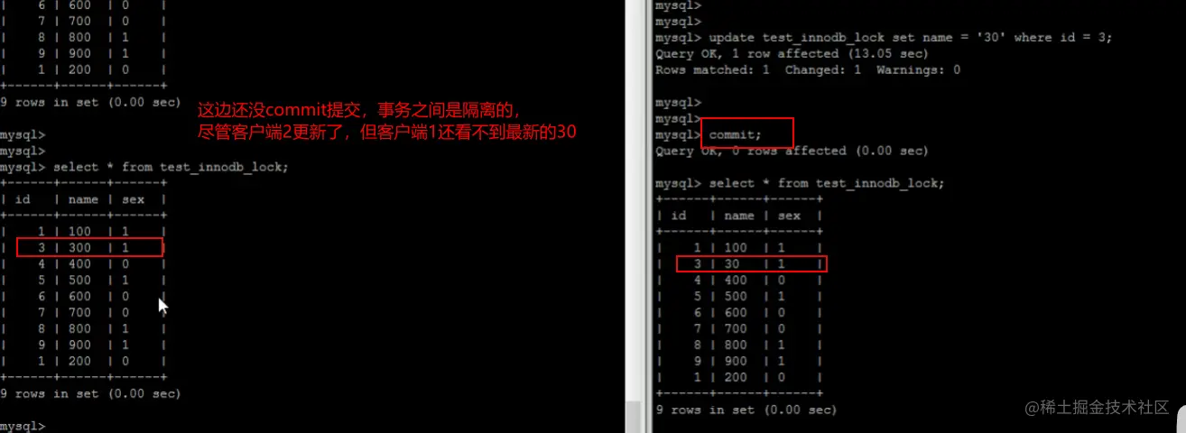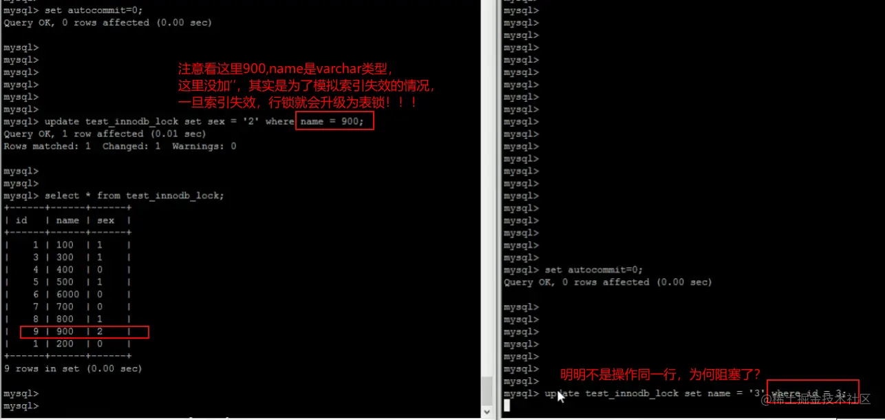 如果使用的是没有索引的字段,比如update user set age=7 where name=‘xxx(即使没有匹配到任何数据)’,那么会给全表加入gap锁。同时,它不能像上文中行锁一样经过MySQL Server过滤自动解除不满足条件的锁,因为没有索引,则这些字段也就没有排序,也就没有区间。除非该事务提交,否则其它事务无法插入任何数据。