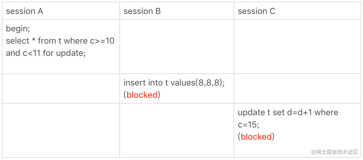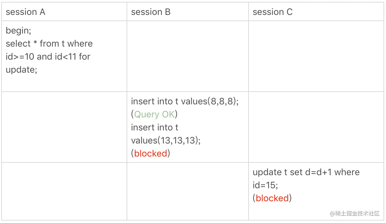 因此最后的范围是[10,15),sessionB的第二条insert会被阻塞,其他都不会