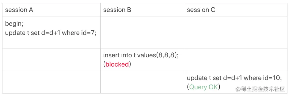 因此sessionC的操作会被阻塞,这是可以理解的。那sessionB呢?为什么不会被阻塞呢?