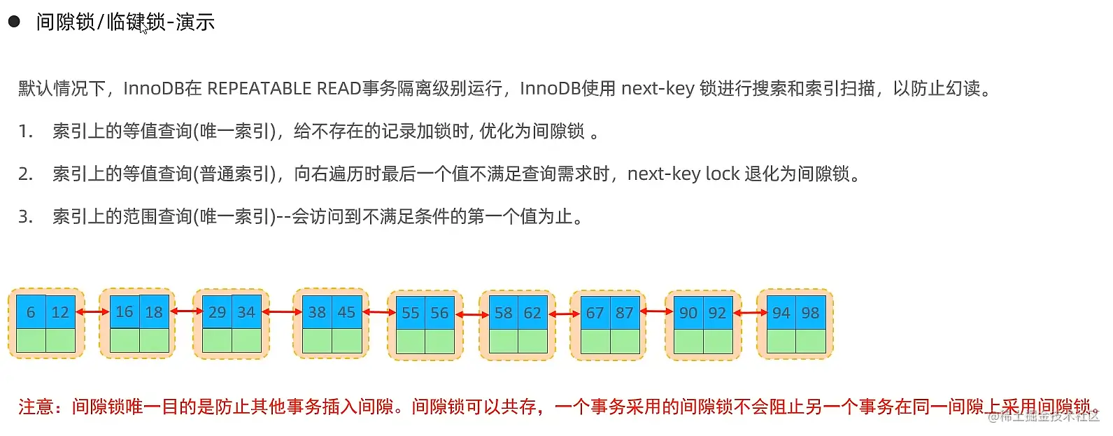 对于最后一个间隙,∞不是一个真正的索引记录,因此,实际上,这个next-key锁只锁定最大索引值之后的间隙。