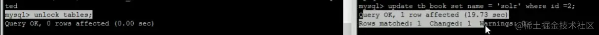 当在客户端一中释放锁指令 unlock tables 后 , 客户端二中的 select 语句 就会立即执行