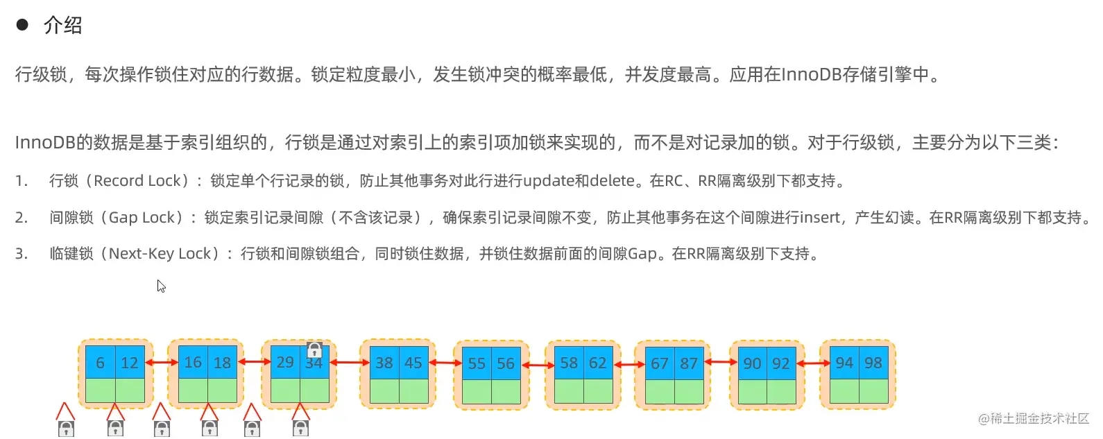 而行级锁则更适合于有大量按索引条件并发更新少量不同数据,同时又有并查询的应用,如一些在线事务处理(OLTP)系统。