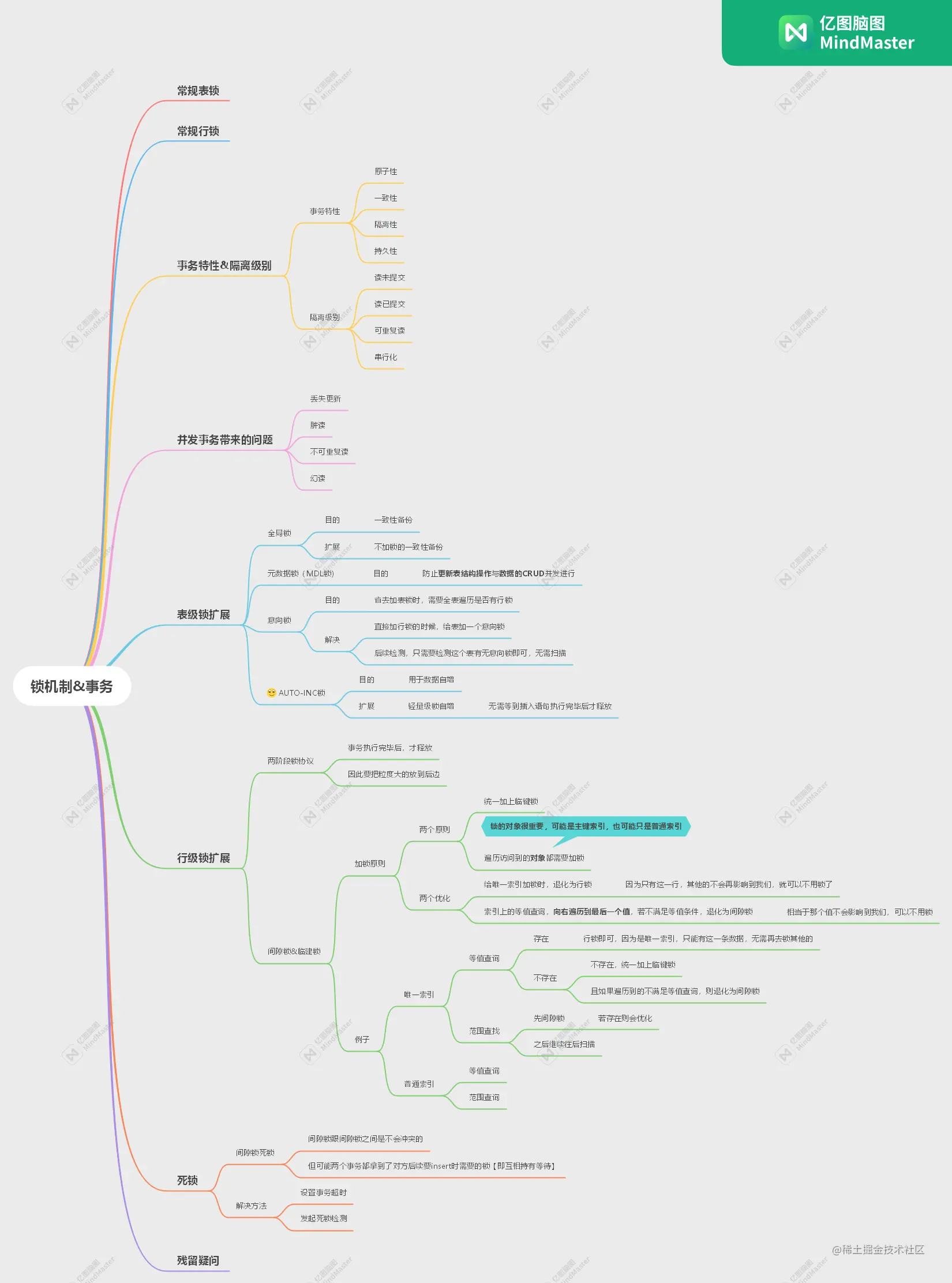 本文详细介绍了MySQL的锁机制,包括表锁与行锁的类型、特点和使用场景,重点讲解了InnoDB的行锁,如共享锁、排他锁、事务隔离级别以及幻读问题。此外,还讨论了表级锁的扩展,如全局锁、元数据锁和意向锁。文章深入浅出,帮助读者理解MySQL中的锁和事务管理。