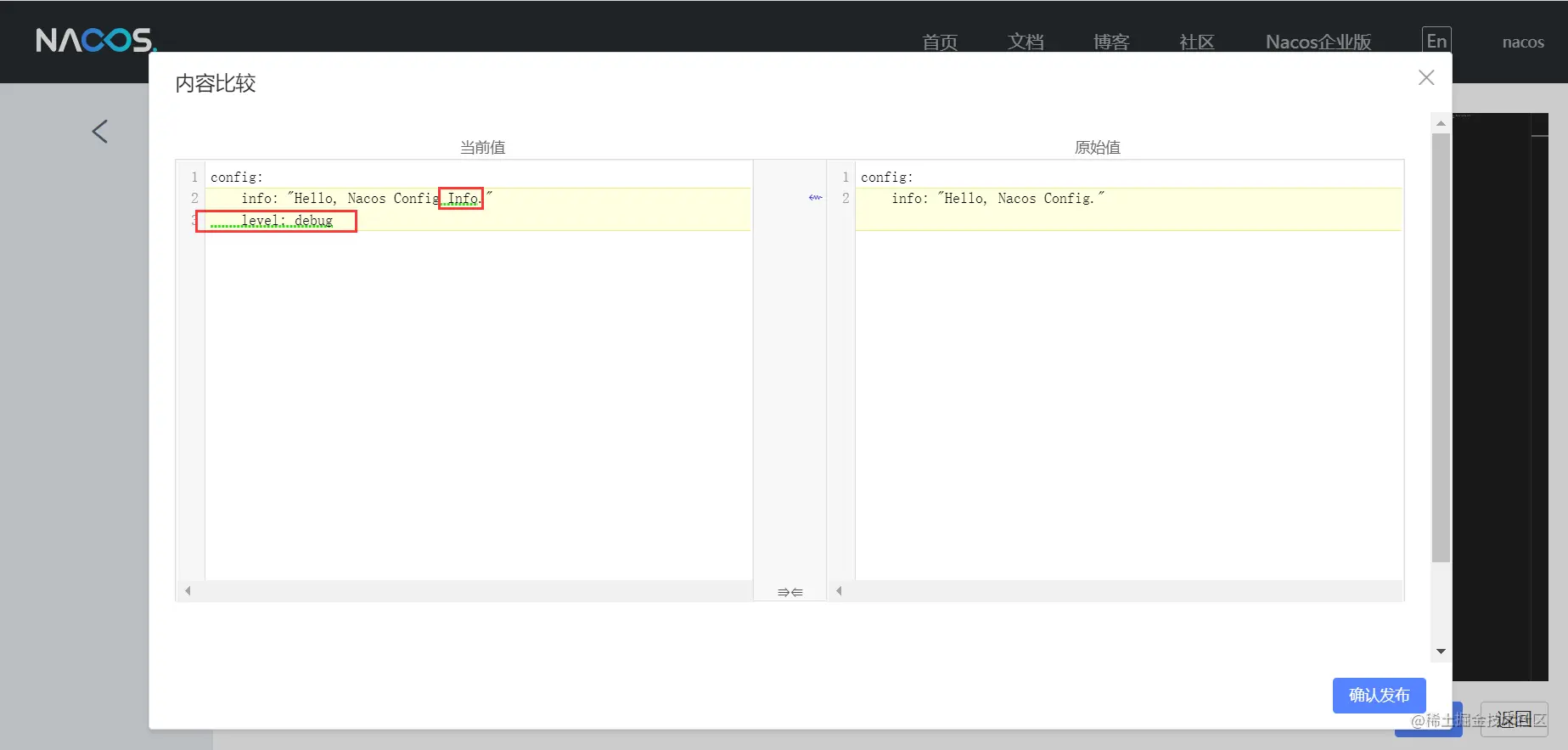 Nacos 配置中心有两个很好用的功能:一个是修改配置时的内容对比,让您一眼就可以看出此次修改的配置内容,防止误操作;第二个是历史版本一键回滚功能,让您能够轻松的实现溯源和回滚配置文件。
