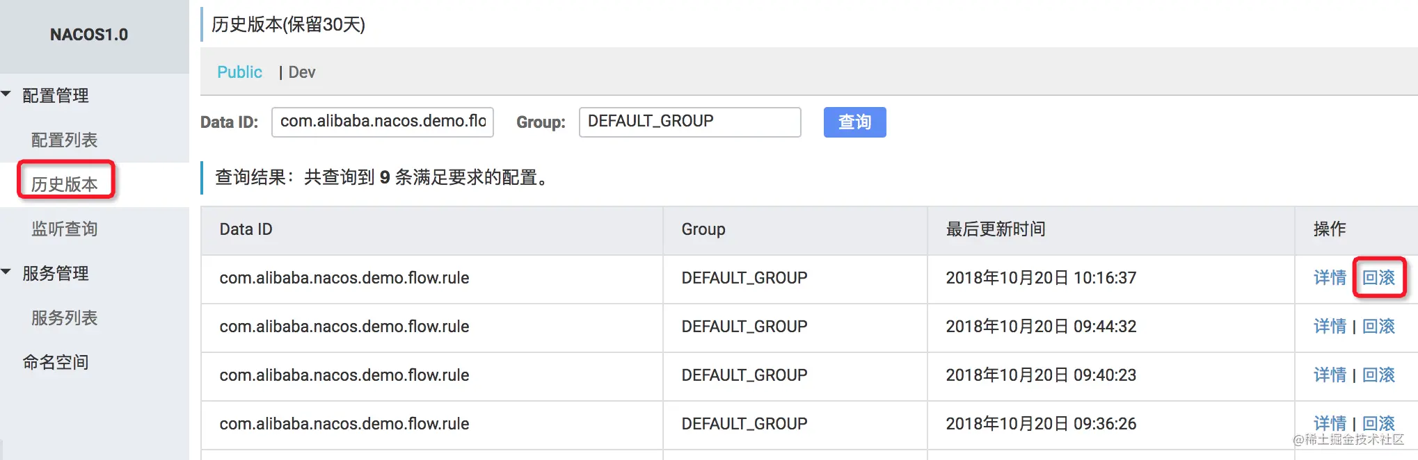 Nacos 通过提供配置版本管理及其一键回滚能力,帮助用户改错配置的时候能够快速恢复,降低微服务系统在配置管理上的一定会遇到的可用性风险。
