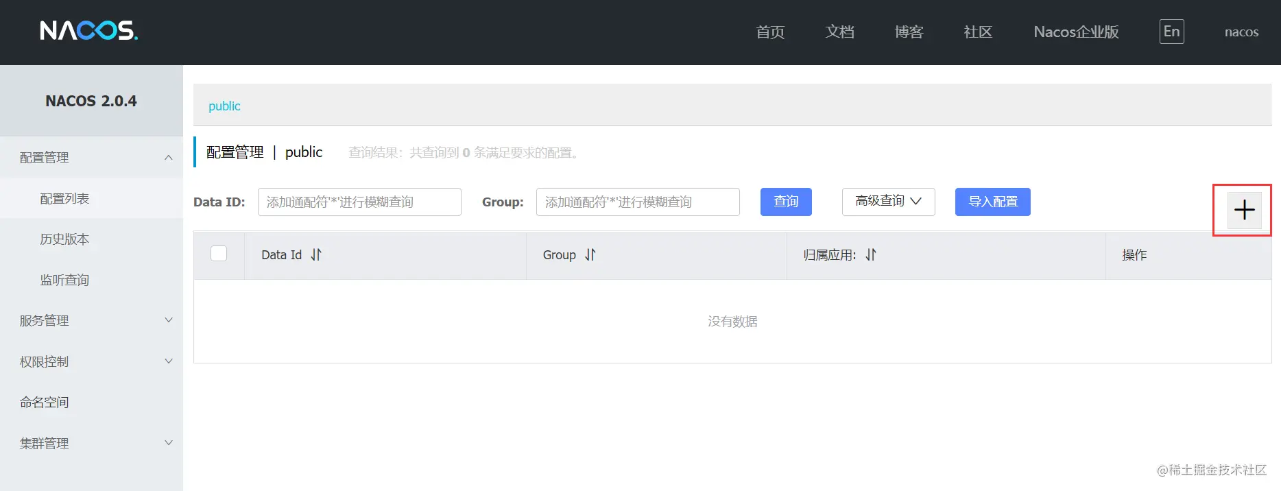 在 Nacos 控制台创建并设置配置文件,执行步骤如下所示。 首先,在配置列表中点击“添加”按钮,如下图所示: