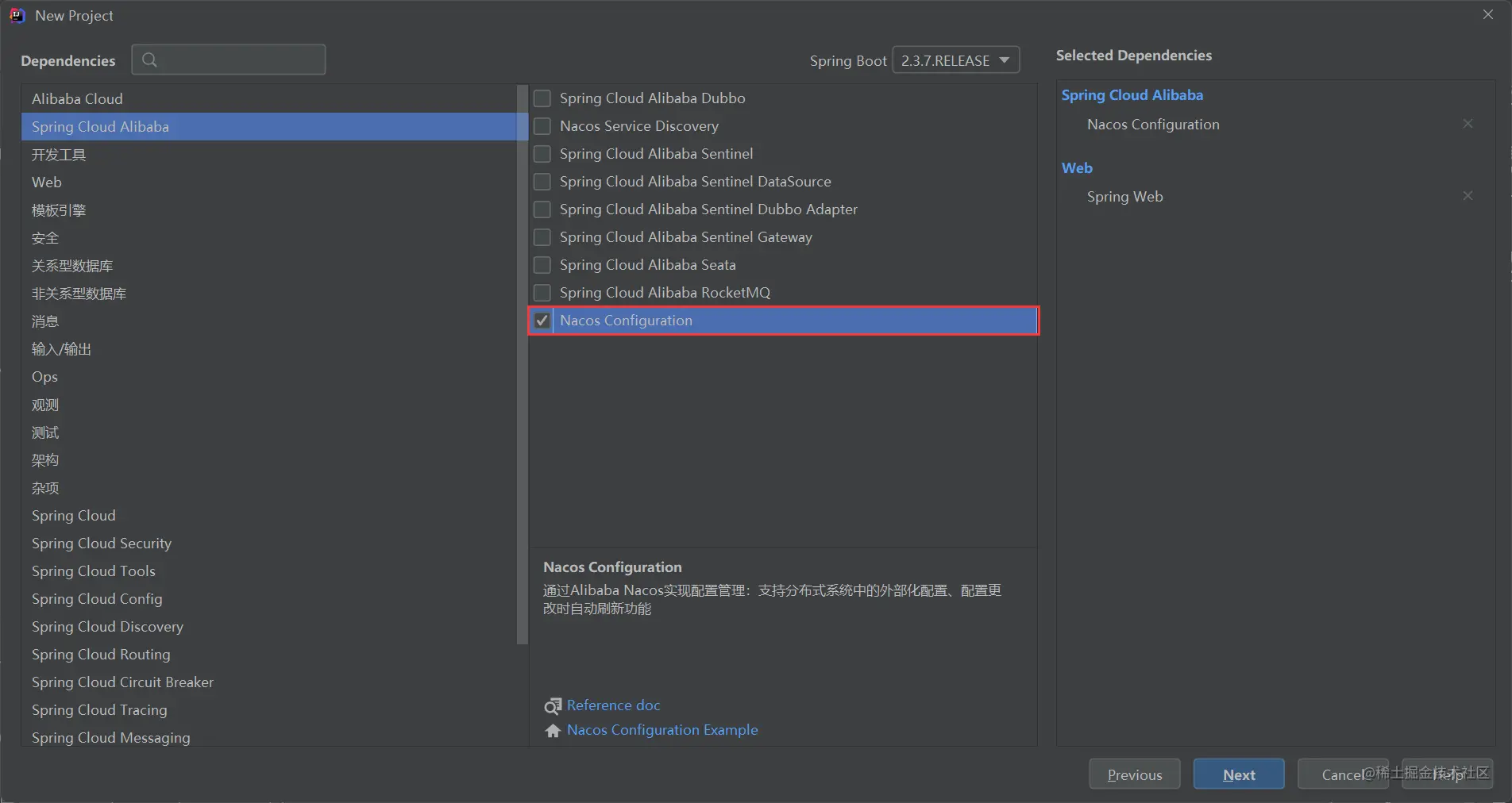 创建一个新的 Spring Boot 项目,添加 nacos config 和 web(非必须)框架依赖,如下图所示: