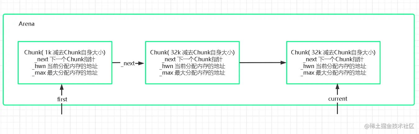 Arena的分配内存是Chunk的链表组成