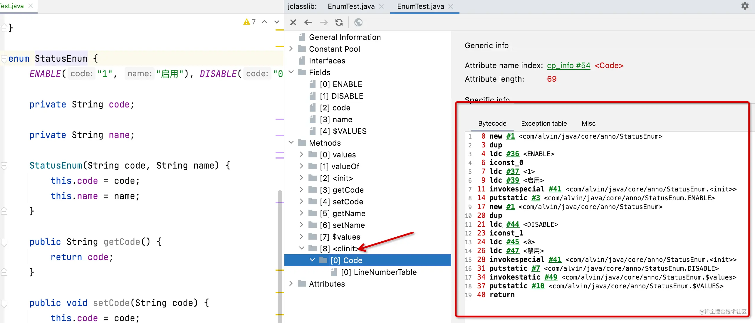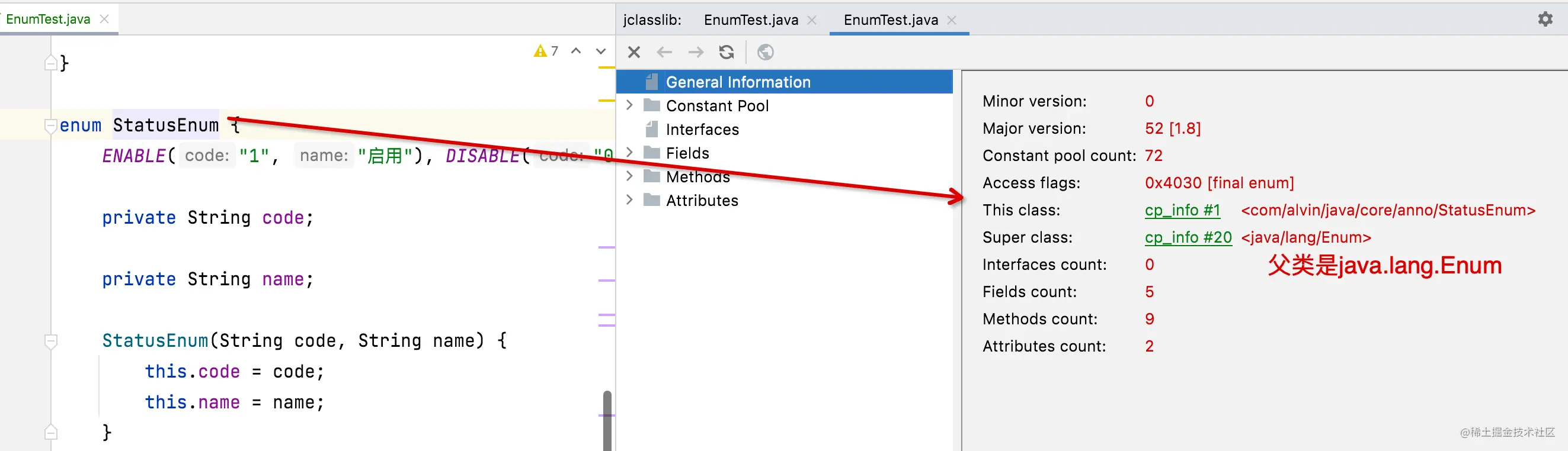 枚举的本质其实一个类,继承了java.lang.Enum这个类。我们可以用idea的插件看下生成的字节码如下: