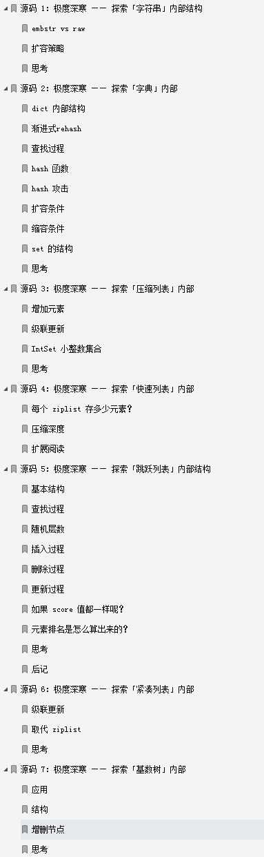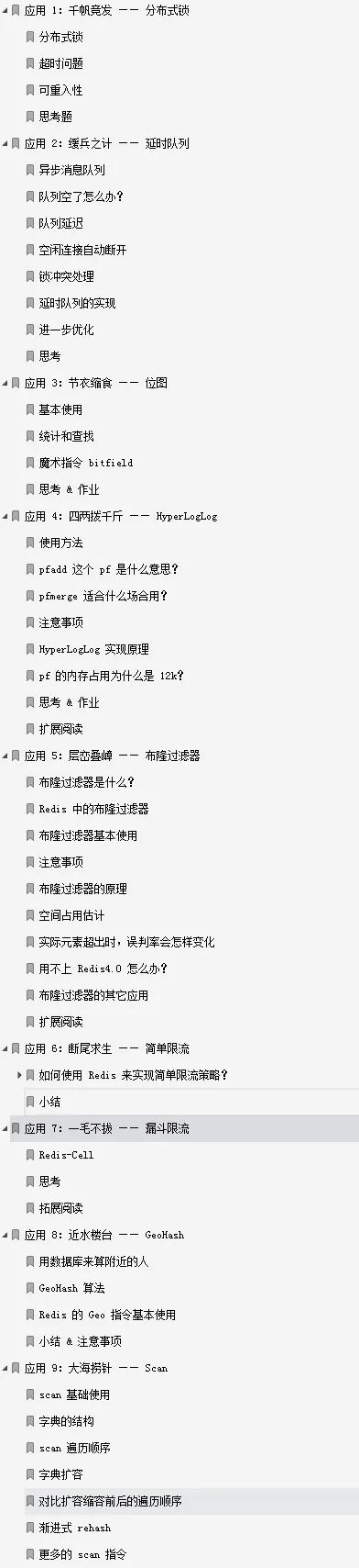 本小册主要讲解笔者从实战中摸索总结的Redis最常用最核心知识点,但限于篇幅和精力,并没有涵盖Redis 全部的内容知识点,比如Redis 内置的lua 脚本引擎就完全没有提到。之所以不讲,是因为在平时的工作中确实从来没有使用过,它就好比关系数据库的存储过程,虽然功能很强大,但是确实很少使用,而且也不易维护,所以就不推荐读者使用了。下面我们就从这基础、应用、原理、集群、拓展、源码等六个篇章来贯通这份redis深度笔记吧