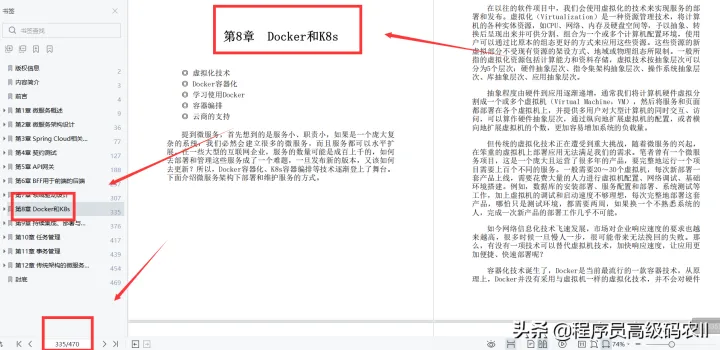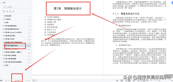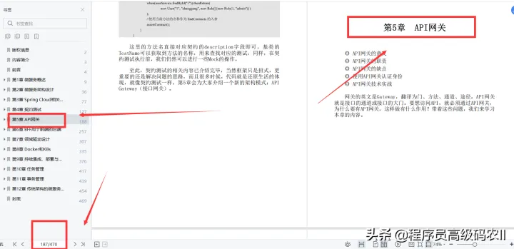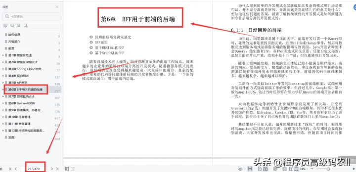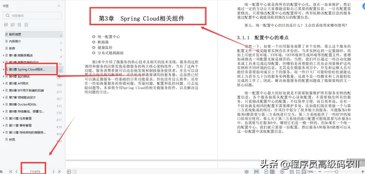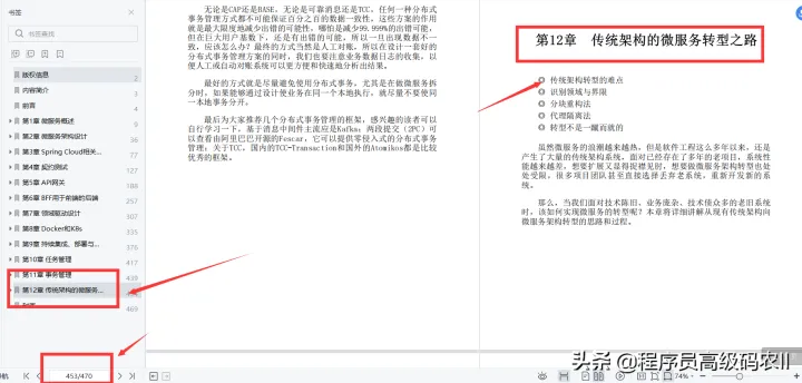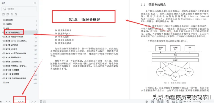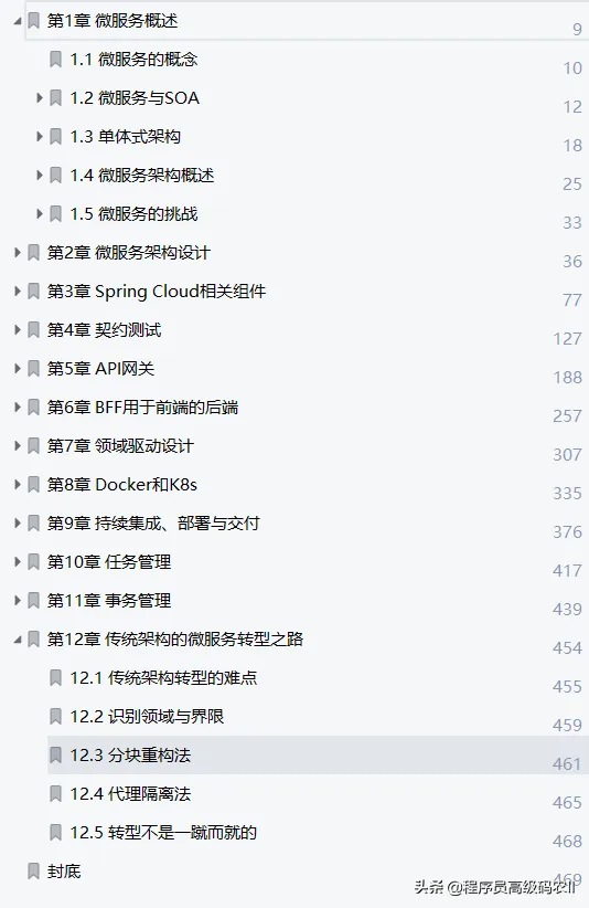本文总共有470页,包含12章的内容,微服务概述微服务架构设计、Spring Cloud相关组件、契约测试、API网关、BFF用于前端的后端领域驱动设计、Docker和K8s、持续集成、部署与交付、任务管理、事务管理、传统架构的微服务转型之路。