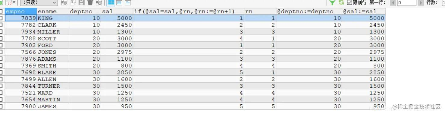 此外,它检查当前行的薪水是否与上一行的薪水相同,如果是,则为当前行分配与上一行相同的行号。使用三个变量(@rn、@r 和@sal)来跟踪行号、基于薪水的行排名以及之前的薪水值。