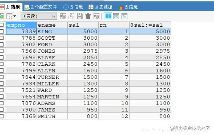 如果它们相同,则为当前行分配与前一行相同的行号(@rn);否则,它使用@r 变量分配一个新的行号(@rn)。最后,它用当前行的薪水更新@sal 变量,以便在下一行进行比较。 ORDER BY 子句按薪水的降序对结果集进行排序。