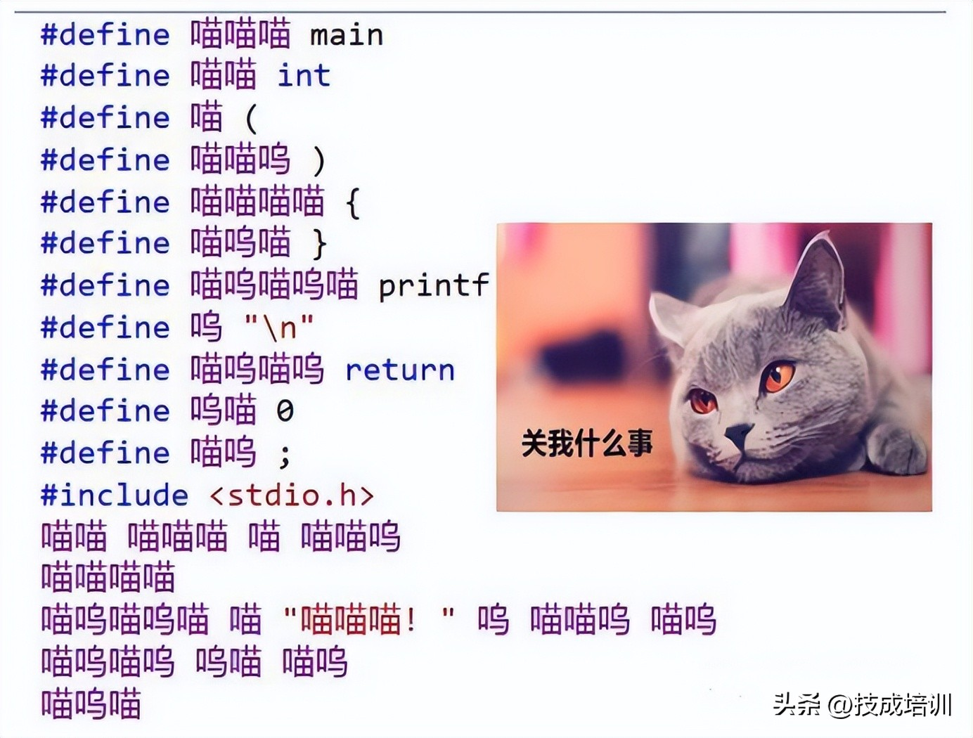 这些千奇百怪的C语言代码,真是大开眼界了! 1、关于随机数这回事 这个随机数有点意思哦! 2、真亦假,假亦真 这是佛中的禅语嘛? 3.你怕是猫迷? 麻烦把这只猫抓出去! 4.C/C++代码里可以插入一行英文字母而不影响程序