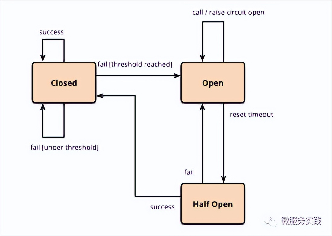 熔断器内部维护了一个熔断器状态机,状态机的转换关系如下图所示: