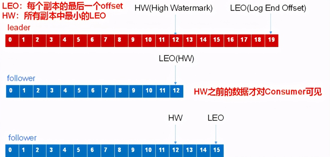 HW:指的是消费者能见到的最大的offset,ISR队列中最小的LEO。