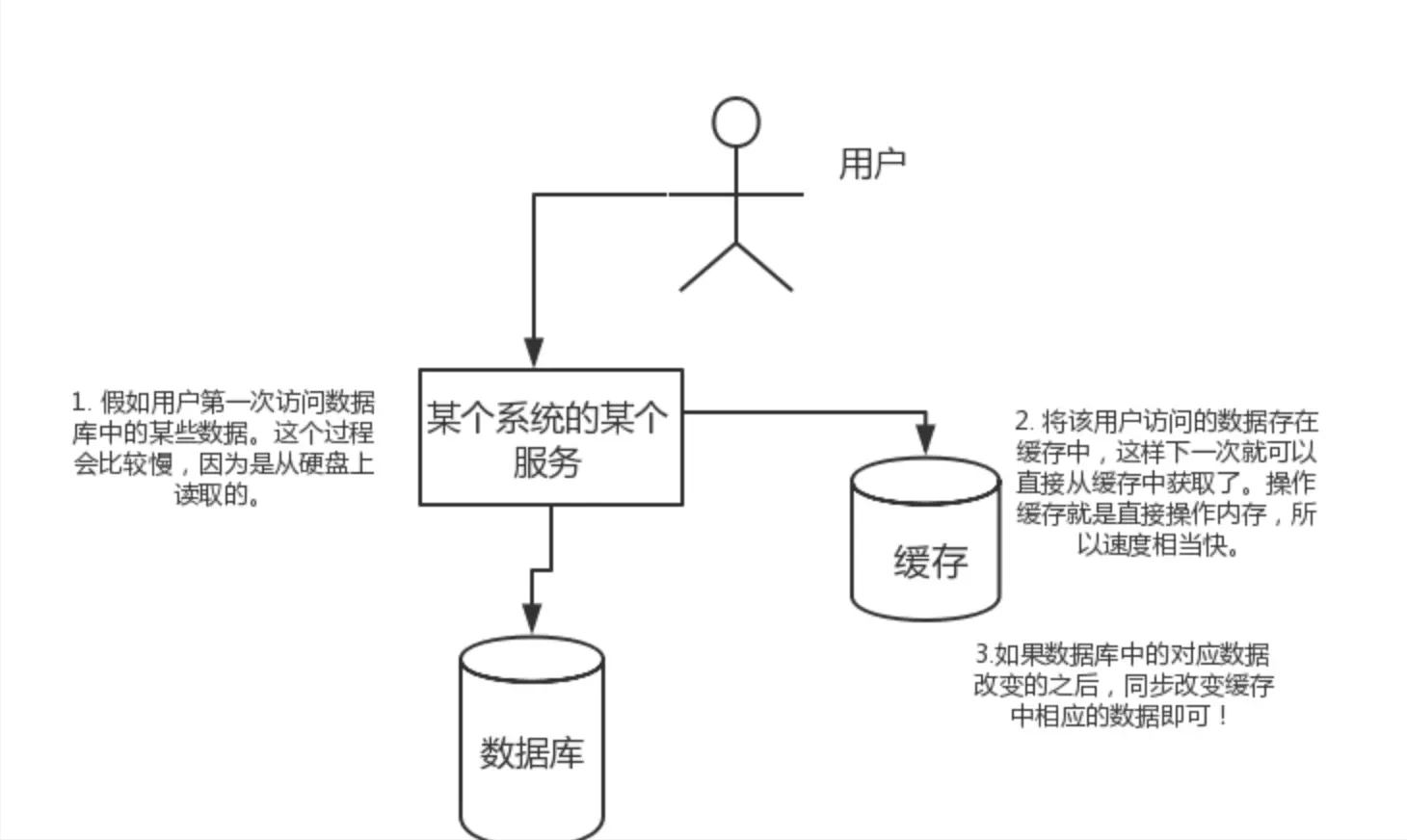 假如用户第一次访问数据库中的某些数据。这个过程会比较慢,因为是从硬盘上读取的。将该用户访问的数据存在数缓存中,这样下一次再访问这些数据的时候就可以直接从缓存中获取了。操作缓存就是直接操作内存,所以速度相当快。如果数据库中的对应数据改变的之后,同步改变缓存中相应的数据即可!