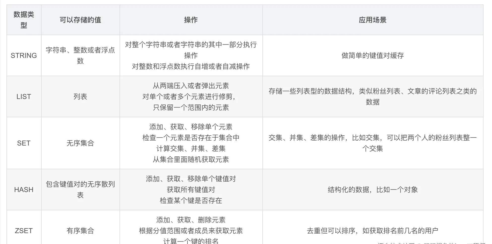 数据类型说明string字符串,最简单的k-v存储hashhash格式,value为field和value,适合ID-Detail这样的场景。list简单的list,顺序列表,支持首位或者末尾插入数据set无序list,查找速度快,适合交集、并集、差集处理sorted set有序的set