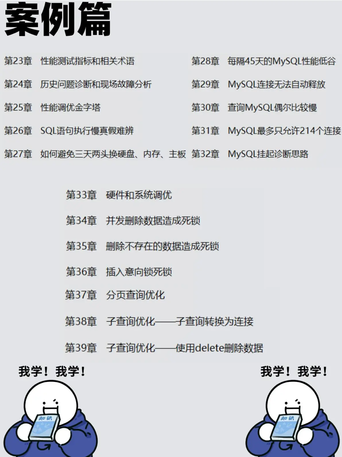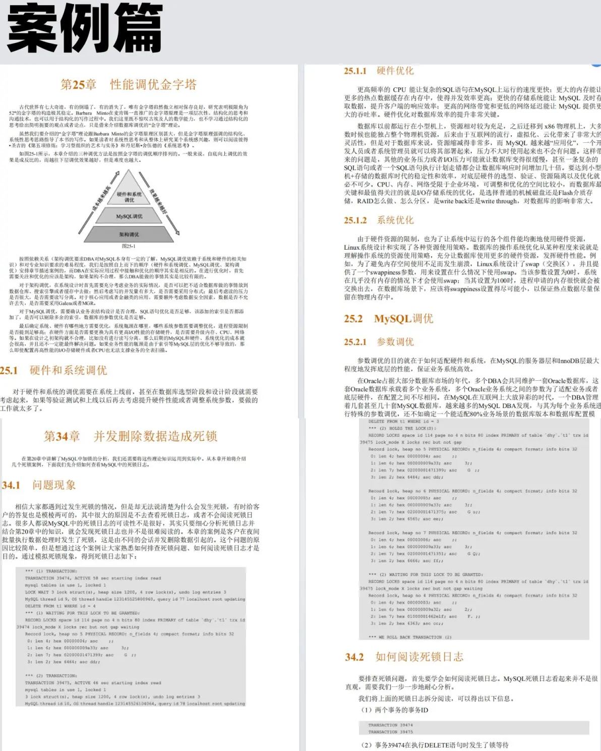 案例篇希望通过自底向上,从硬件和操作系统到MySQL参数/SQL语句的优化,再到架构设计.上的优化,向读者展示在实际的应用中存取数据,使用结构化数据、关系数据库时可以尝试的一些优化手段。