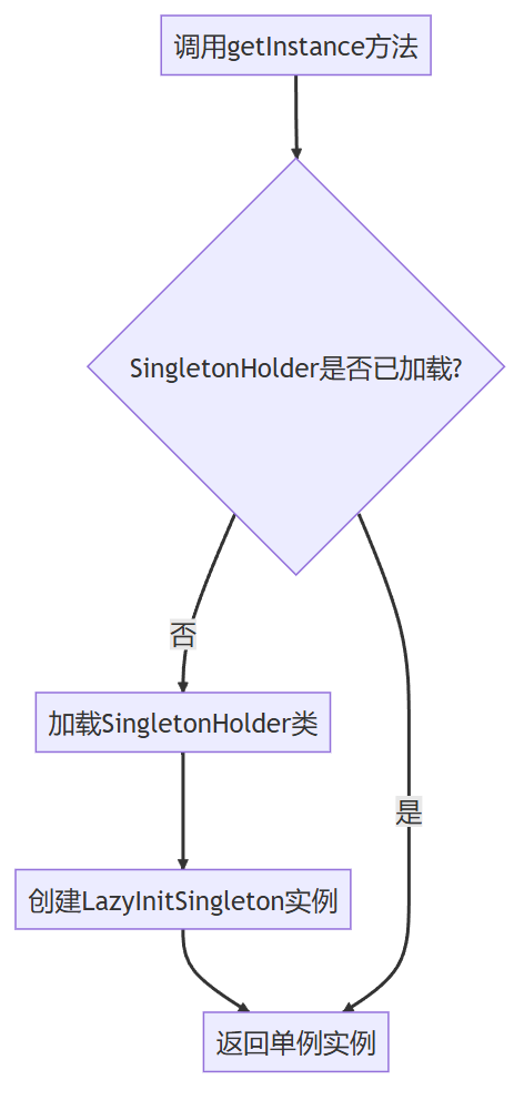 - 外部类 LazyInitSingleton 加载时,内部类 SingletonHolder 不会立即被加载