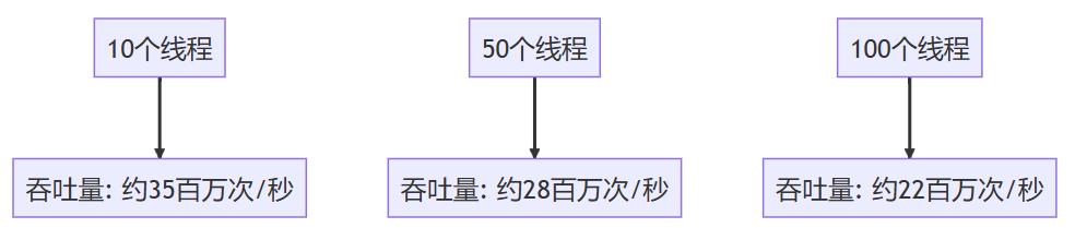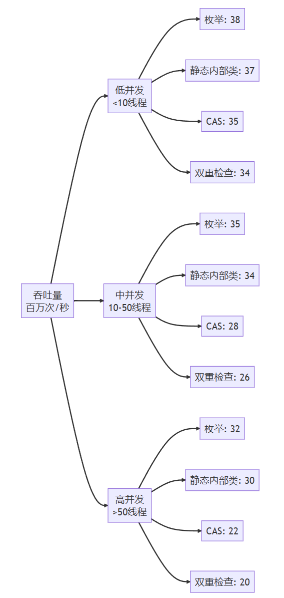 从数据可以看出,枚举和静态内部类在各种并发级别下性能最好,且随着并发增加性能衰减较少。CAS 方法在高并发下性能下降较明显,但仍优于使用锁的方法。这就像不同道路在交通流量增加时的通行效率一样。