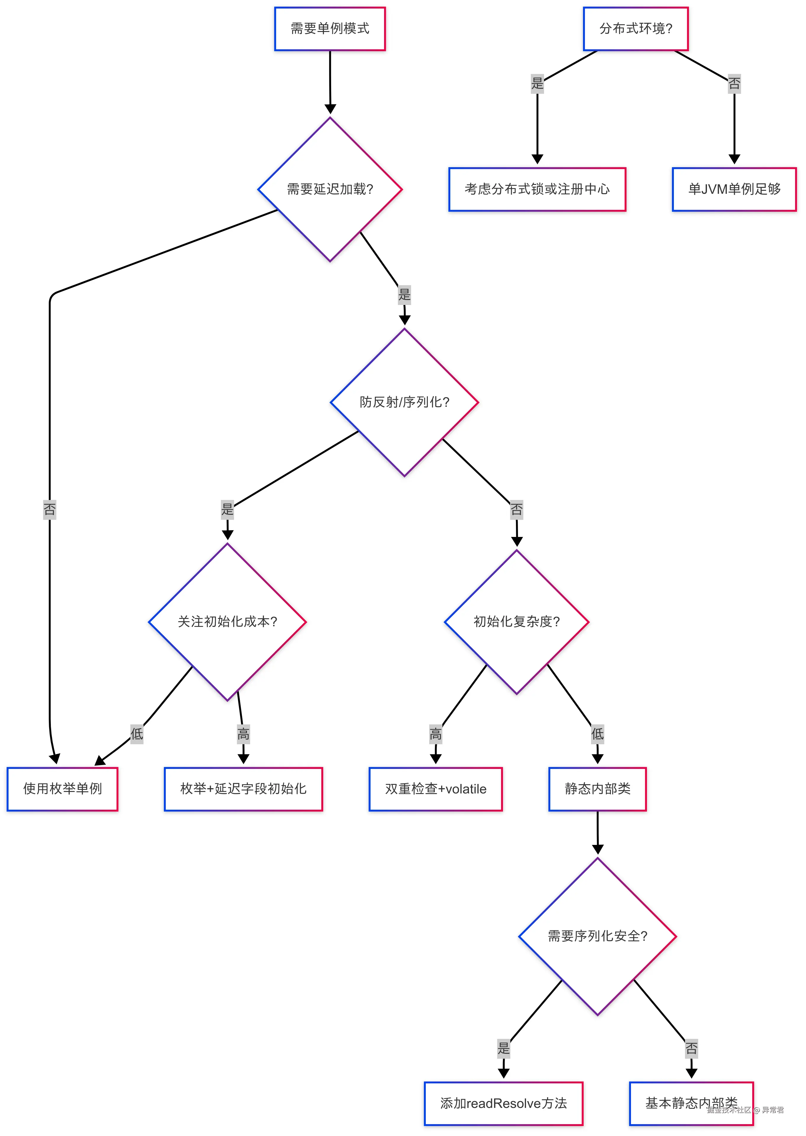 下面的决策流程图可以帮助你选择合适的单例实现方式: