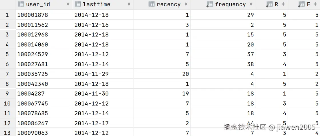 仅在会员(购买过商品的用户)范围内,进行价值划分,R/F等级为1-5,由于本项目的数据不涉及M(Monetary),所以只做4类划分。