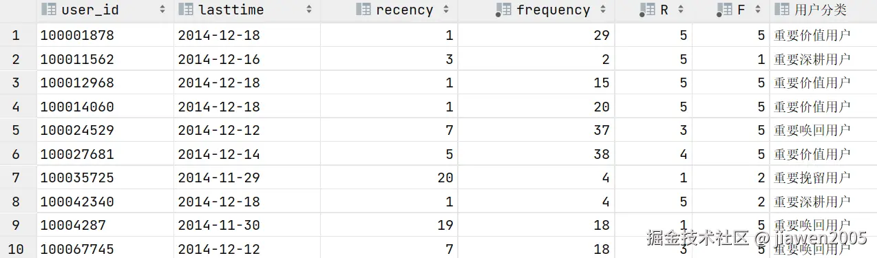 - 重要深耕用户,R高F低。这类用户粘性不强,近期有消费行为,可能是针对需要的商品直接下单,不会过于频繁地进行其他商品的浏览、购买。可推荐更符合用户喜好、性价比高商品,吸引其进行购买,逐渐建立消费习惯。