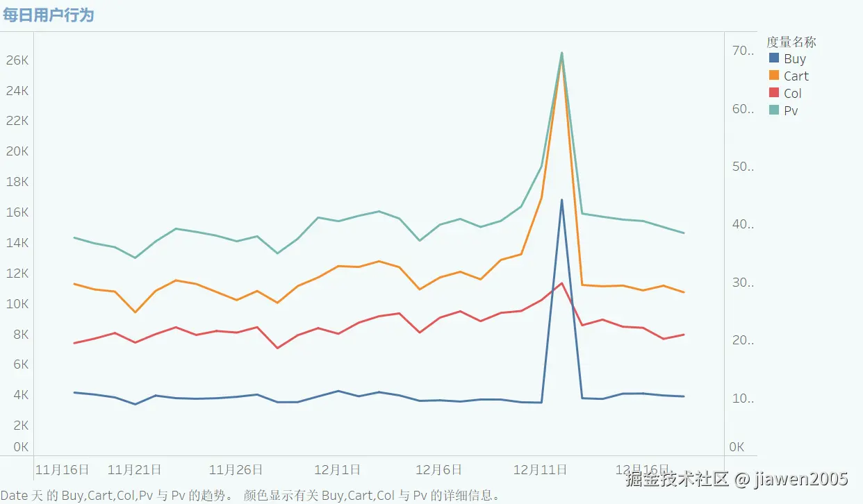 本项目中的收藏col与加购cart的行为不是相互独立的,都是确定购买buy意向的行为,没有先后之分。因此,从浏览pv、加购cart、购买buy这一路径来简要分析。
