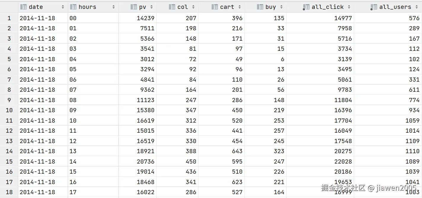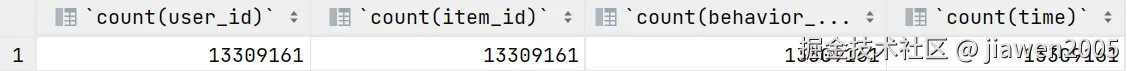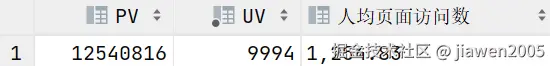 本项目数据源共13309161条,PV有12540816条,UV有9994条,人均页面访问数为1254.83。代码如下: