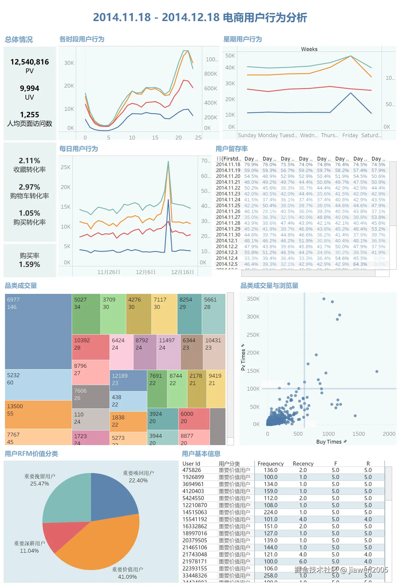 本项目以阿里巴巴移动电商平台的真实用户-商品行为数据为基础,使用SQL进行数据清洗,以AARRR模型、RFM模型为基础展开分析,再用Tableau做可视化,最后从提升用户活跃度、促进商品成交、差异化用户营销三个方面提出建议。