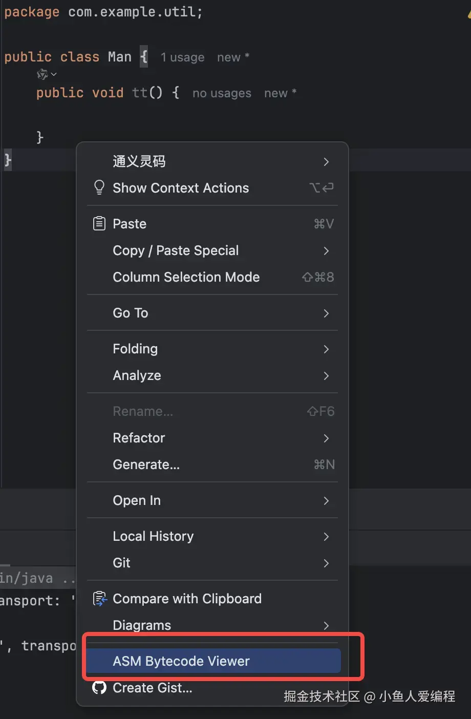 如若觉得使用命令麻烦,还可以借助插件,idea里搜索ASM Bytecode Viewer并安装。 打开.java文件,并右键选择: