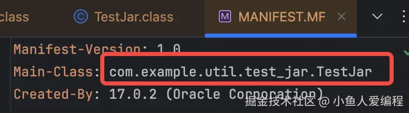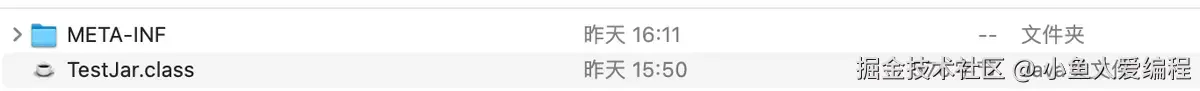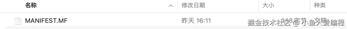 除了包含.class外,还包含了META-INF文件夹,该文件夹里有MANIFEST.MF文件,文件的内容里有一项就是我们在manifest.txt里指定的主类。