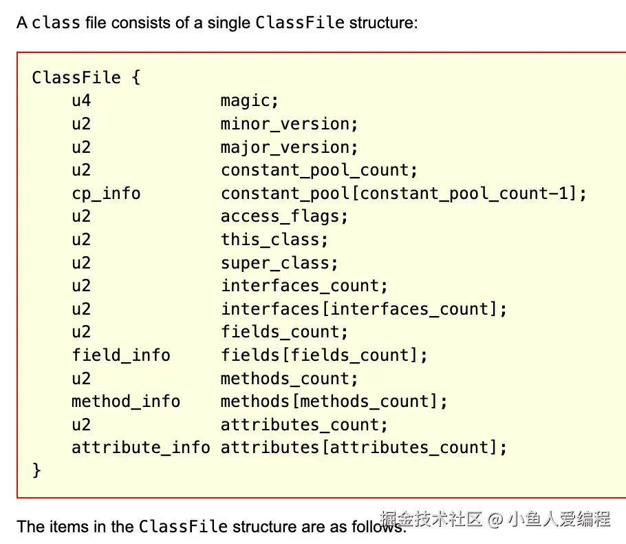 .class文件是二进制,JVM能够读取、识别并解释执行它。如果我们没有.java文件但却是想要修改.class文件改怎么办呢? 首先我们应该知道.class文件的构成部分,Oracle官网图如下: