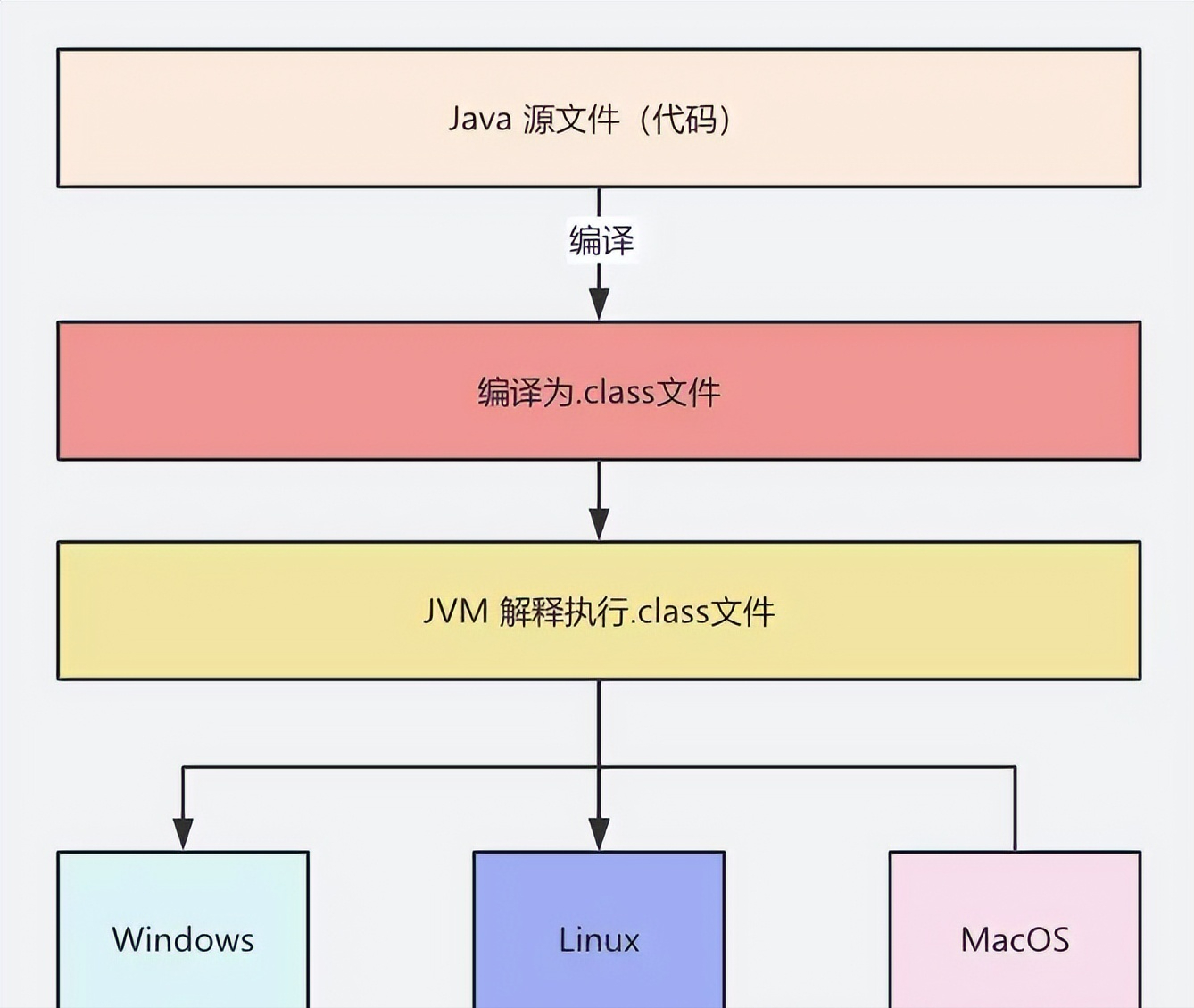 Java语言的源代码如.java结尾的文件经过编译后变为.class(字节码)文件。这个.class文件可以在Windows、Linux、MacOS等被解释执行,而无需区分平台进行编译,这也是Java的最具代表的特性之一:跨平台(一次编译,到处运行 Write Once, Run Anywhere)。
