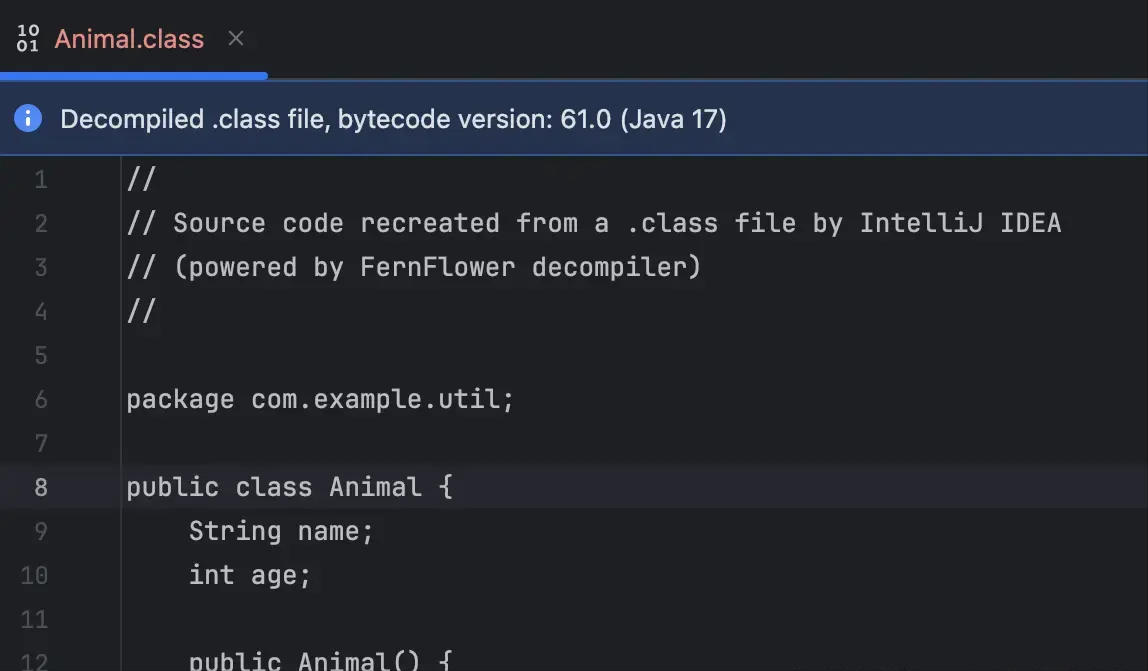 看似和源码没有任何差异呢?其实不然,这是IDE自动帮助我们将.class转为了可阅读的源码形式,实际的.class文件内容是二进制的,肉眼看不出来细节。