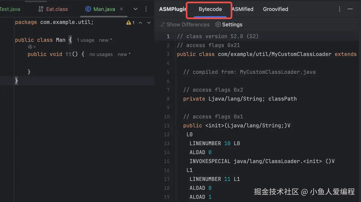 此时可以看到bytecode,和使用javap差不多,还可以切换到ASMified,了解如何使用指令生成字节码内容。