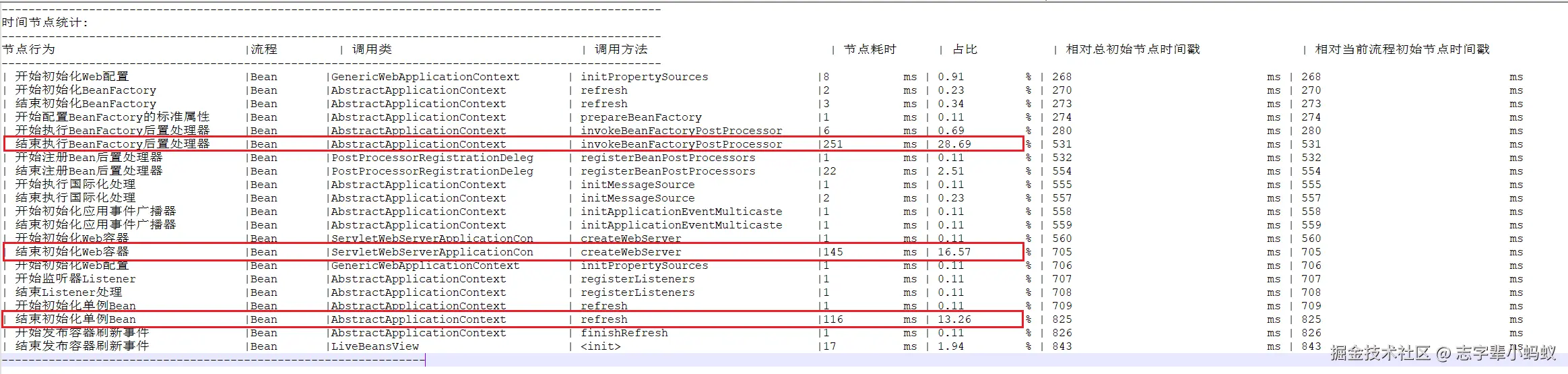 - 最耗时的三个地方 : BeanFactory后置处理器 : 这个是由于 Spring 做Bean管理的时候 ,大量用到了这类对象 初始化Web容器 : 这能理解 ,创建 Web 容器 ,Tomcat 等处理都是要耗时的 结束初始化单例Bean : 这就是 Bean 创建的主流程 ,当然也会很慢