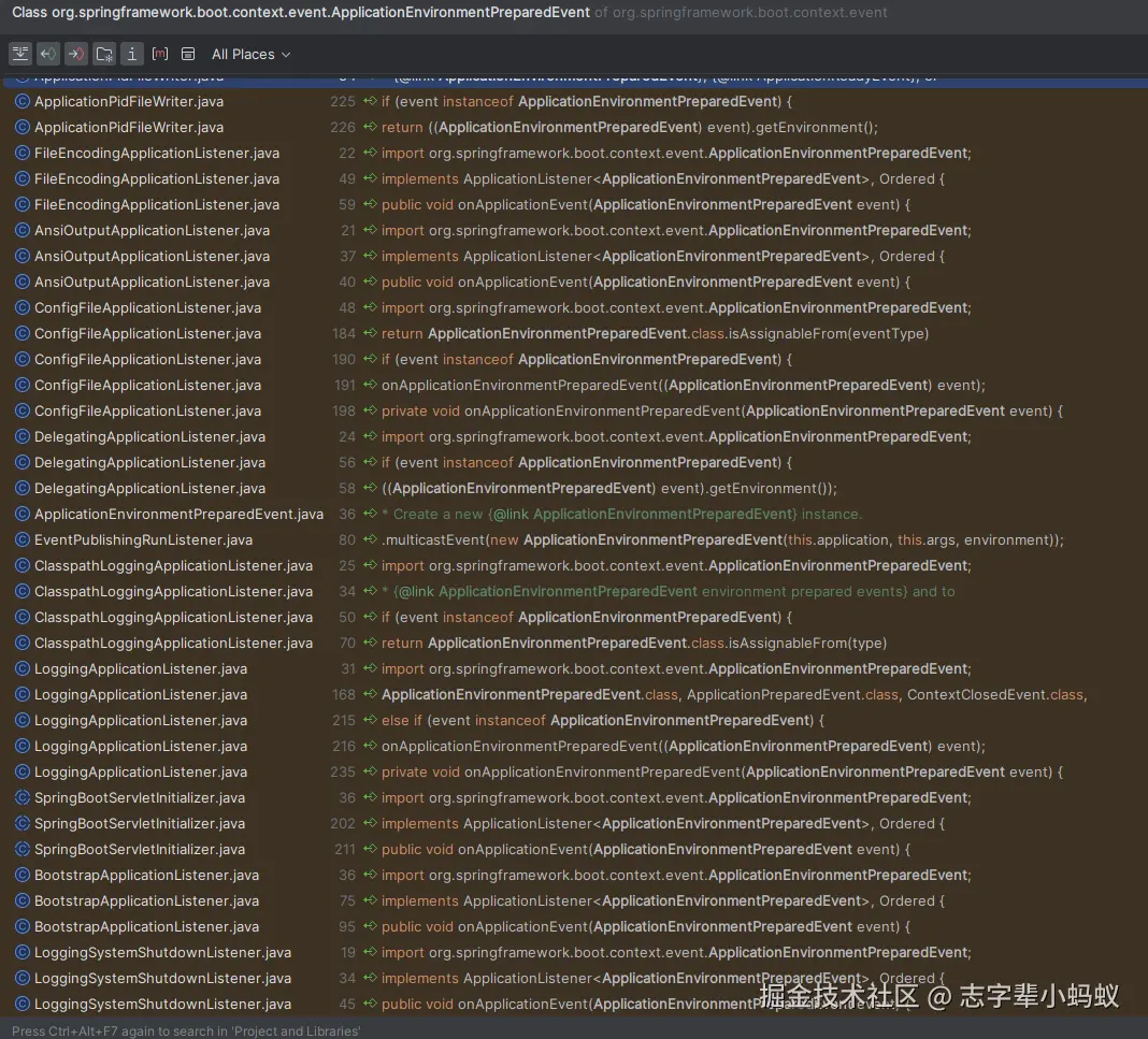- ApplicationEnvironmentPreparedEvent 有很多很复杂的 Listener 在监听 ConfigFileApplicationListener : 用于加载外部文件 SpringBootServletInitializer : 用于 Servlet容器集成 BootstrapApplicationListener : 初始化 SpringCloud 到的配置