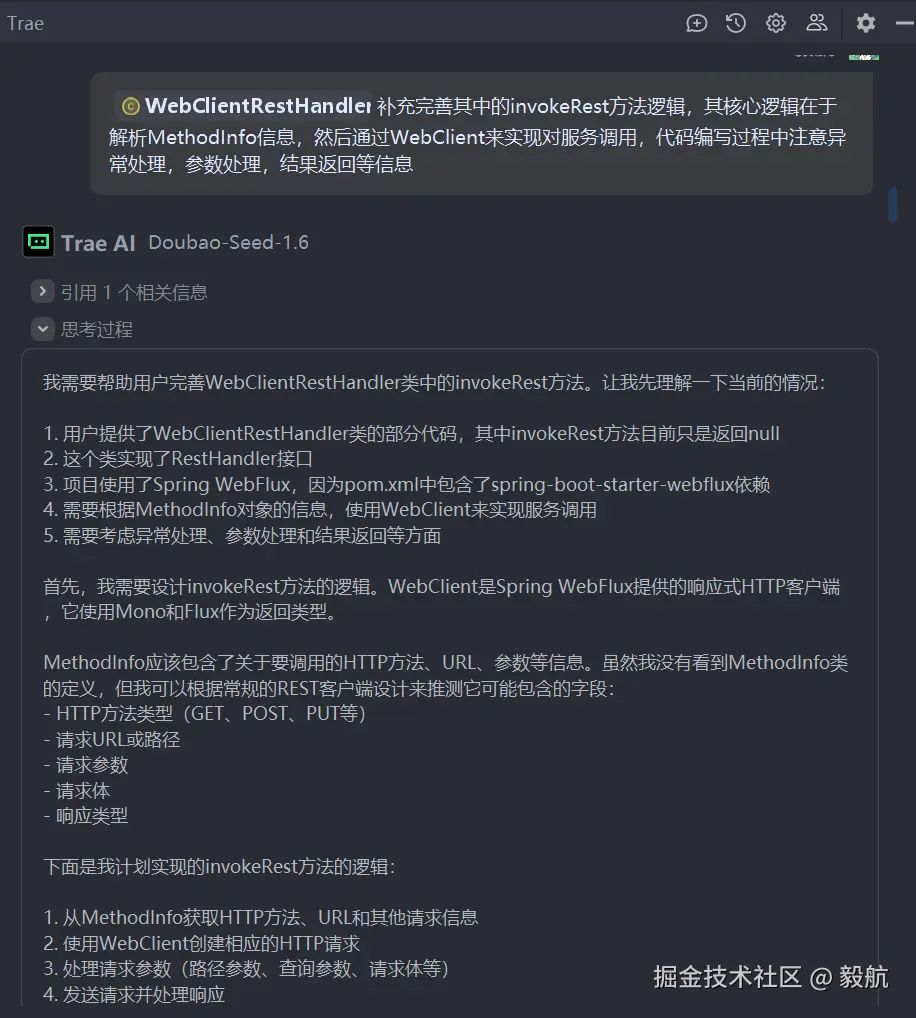 问题2: Trae在构建代码时,对于已经提供形参的方法,其貌似并不会读取形参中的变量信息,而是会根据自己的思考,假设其中有某些变量,这一点需要多轮对话来解决。