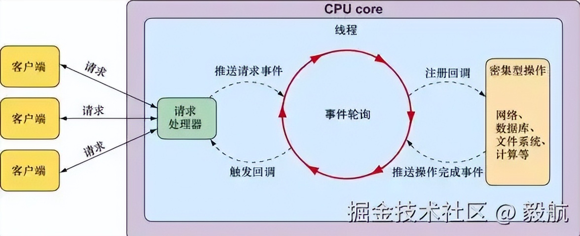 当某请求需要执行数据库操作时,线程不会进入阻塞等待状态,而是通过注册回调函数预设结果处理逻辑,随即转向处理下一个就绪任务;待数据库操作完成并返回结果后,事件轮询会触发回调流程,由空闲线程继续执行该请求的后续处理步骤。