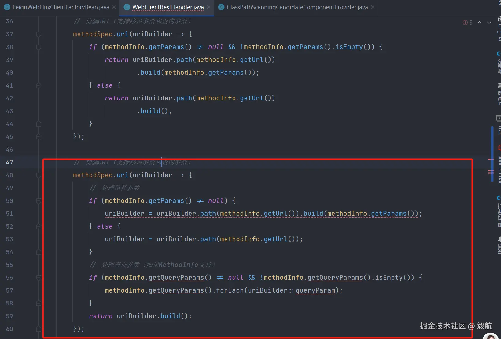 问题1:在使用UriBuilder参数时,其中的build方法方法其实是会返回URL的类型,对于返回的URL则不能继续在进行构建,所以代码47行会报错。