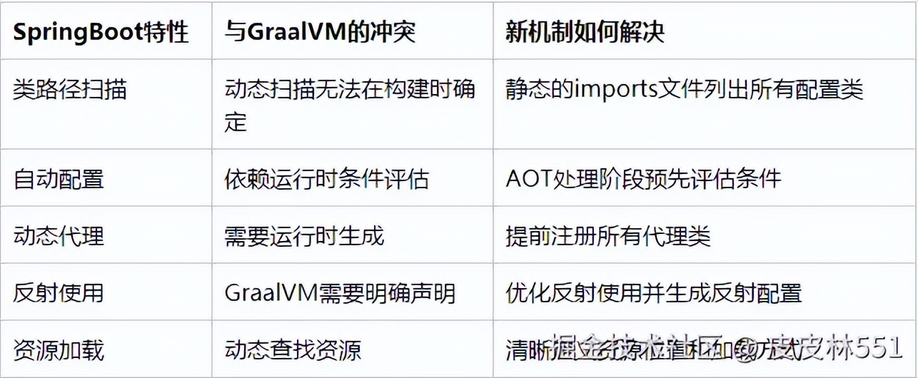SpringBoot框架面临的主要挑战是其动态特性与GraalVM静态分析模型之间的矛盾: