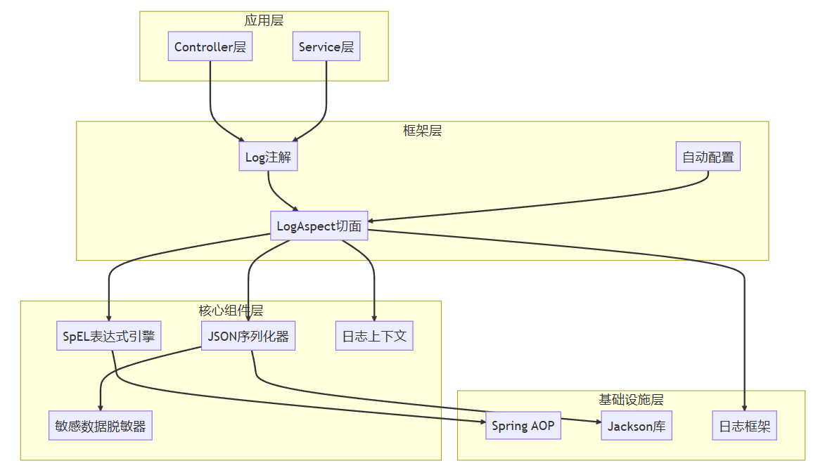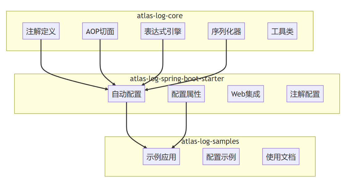 Atlas Log 采用分层架构设计,基于 Spring Boot Starter 模式实现自动配置和组件装配。架构设计遵循高内聚、低耦合的原则,确保组件间职责清晰,易于扩展和维护。