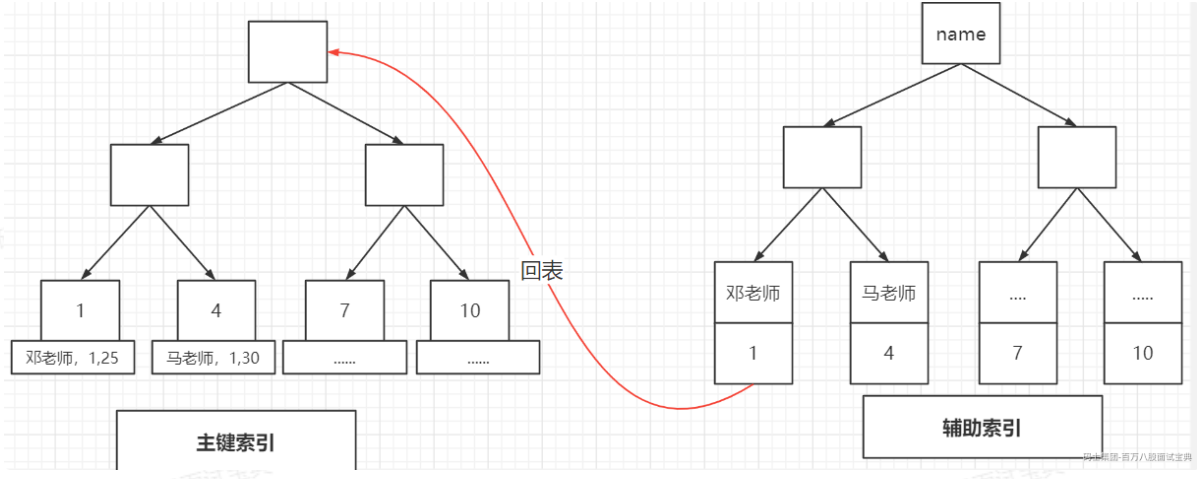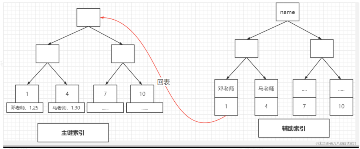 非主键索引,我们先通过索引找到主键索引的键值,再通过主键值查出索引里面没 有的数据,它比基于主键索引的查询多扫描了一棵索引树,这个过程就叫回表。