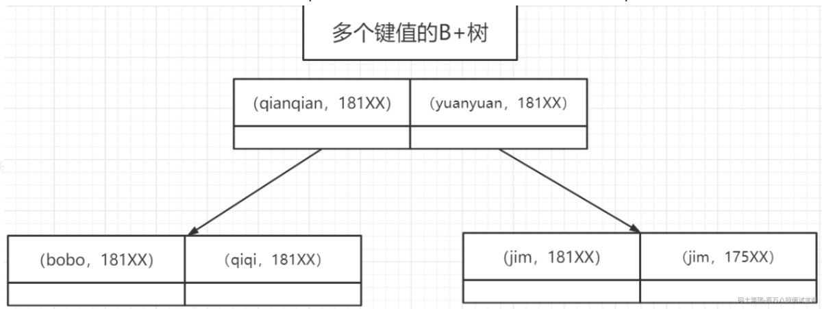 这个时候我们使用 where name= 'jim' and phone = '136xx '去查询数据的时候,B+Tree 会优先比较 name 来确定下一步应该搜索的方向,往左还是往右。如果 name相同的时候再比较 phone。但是如果查询条件没有 name,就不知道第一步应该查哪个节点,因为建立搜索树的时候 name 是第一个比较因子,所以用不到索引。