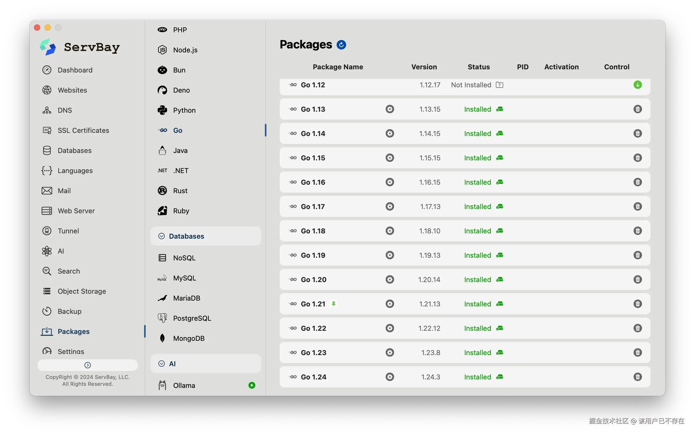 在开始之前,先介绍一个工具。写出优雅的代码,一个顺手的开发环境是基础。我自己现在用的是 ServBay,它给我最大的便利就是可以一键安装 Go 环境。特别是对于需要同时维护多个项目的开发者来说,ServBay 支持多个 Go 版本并存,互不干扰,切换起来非常方便。不用再手动配置 GOPATH、GOROOT 这些环境变量,省下了不少折腾的时间。
