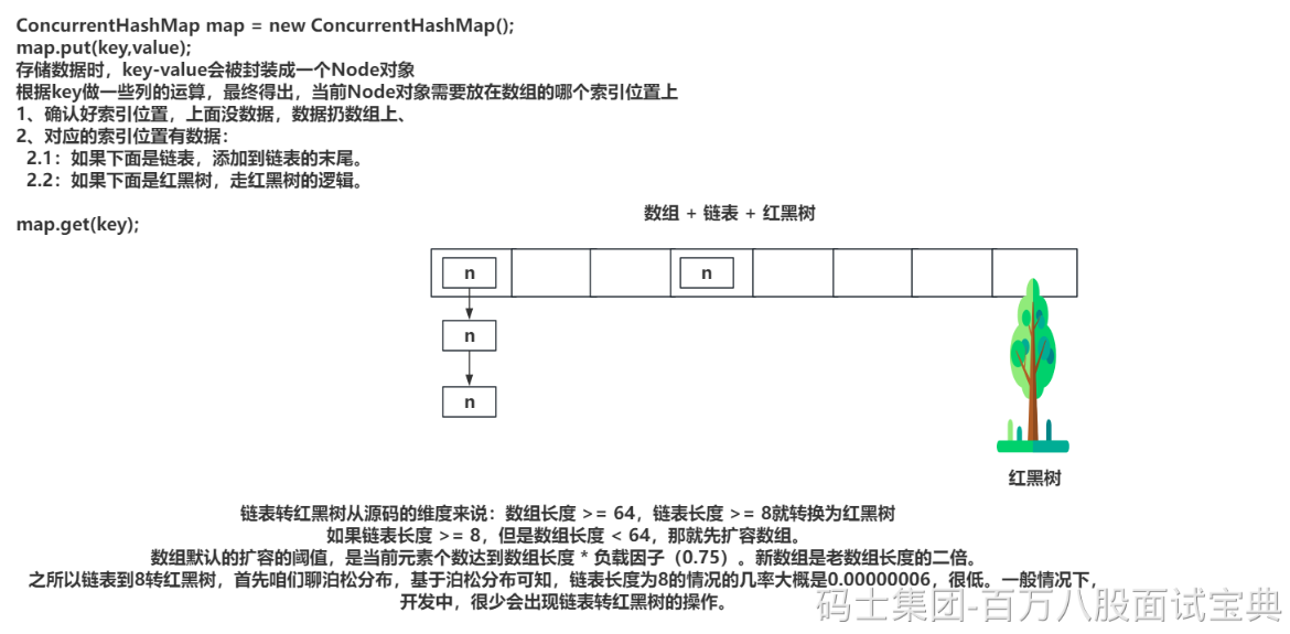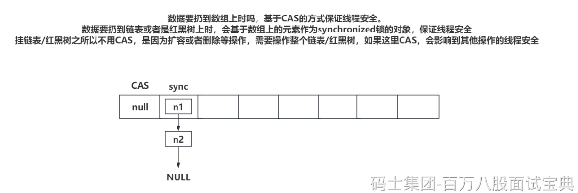 链表/红黑树扔数据,synchronized锁数组元素保证线程安全。