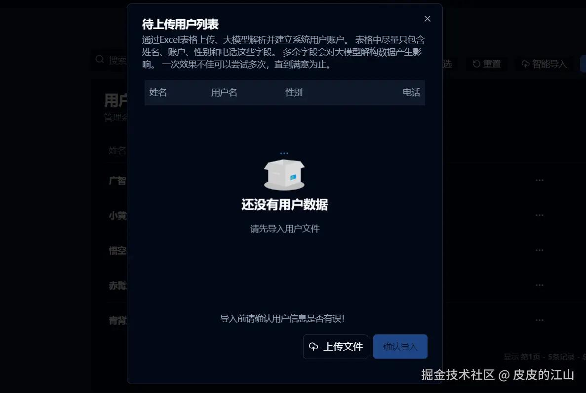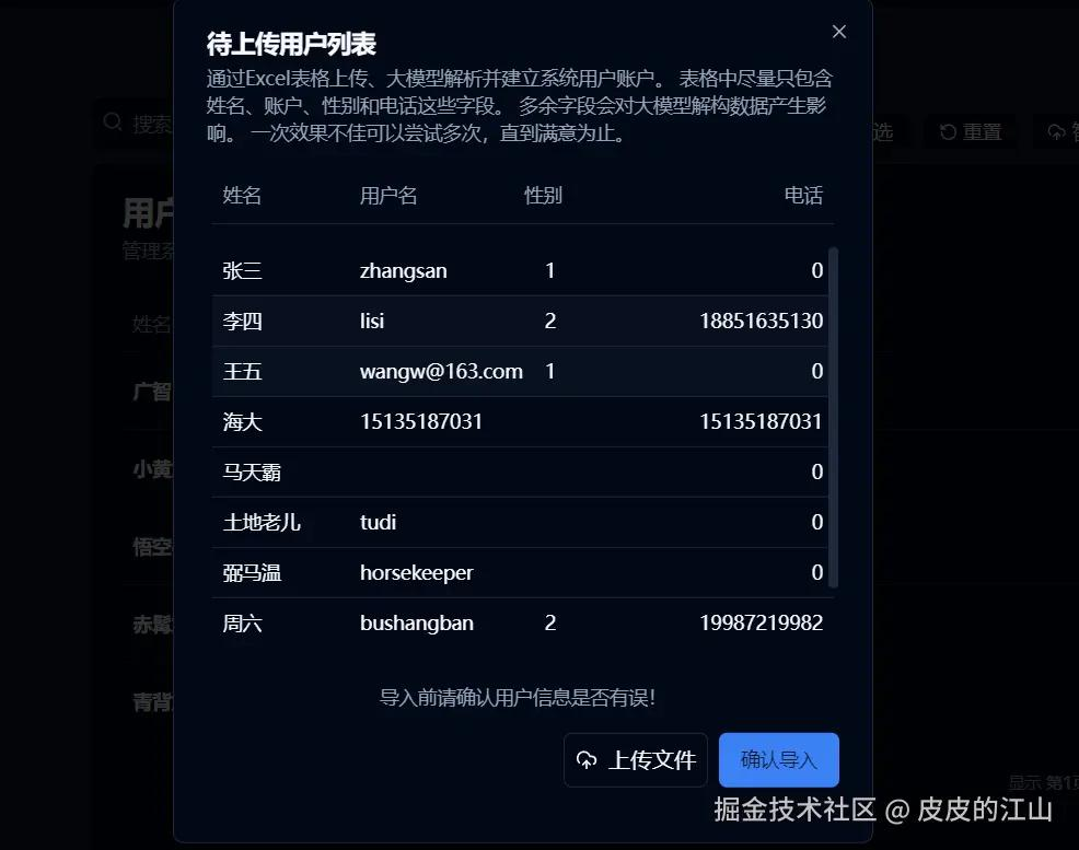点击上传文件,选择上面的表格进行上传,之后大模型接口会返回解构后的用户队列。 这是大模型识别的结果展示: